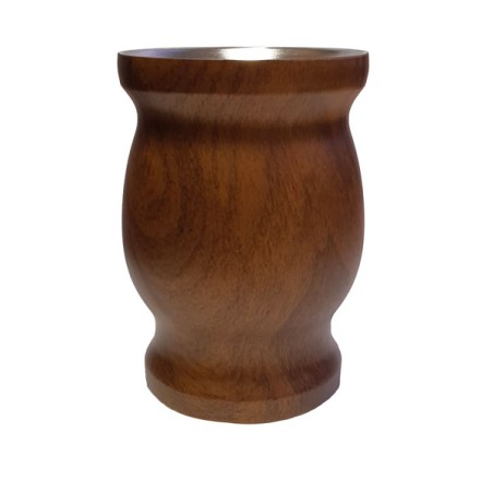 Mate aus Edelstahl mit brauner holzähnlicher Verzierung.