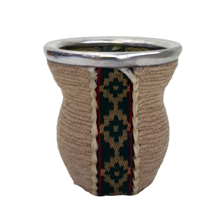 Beau maté en verre, recouvert de tissu et d’une bande décorative au motif pampa. Un anneau en aluminium entoure la large ouverture du maté. Plusieurs coloris à choix.